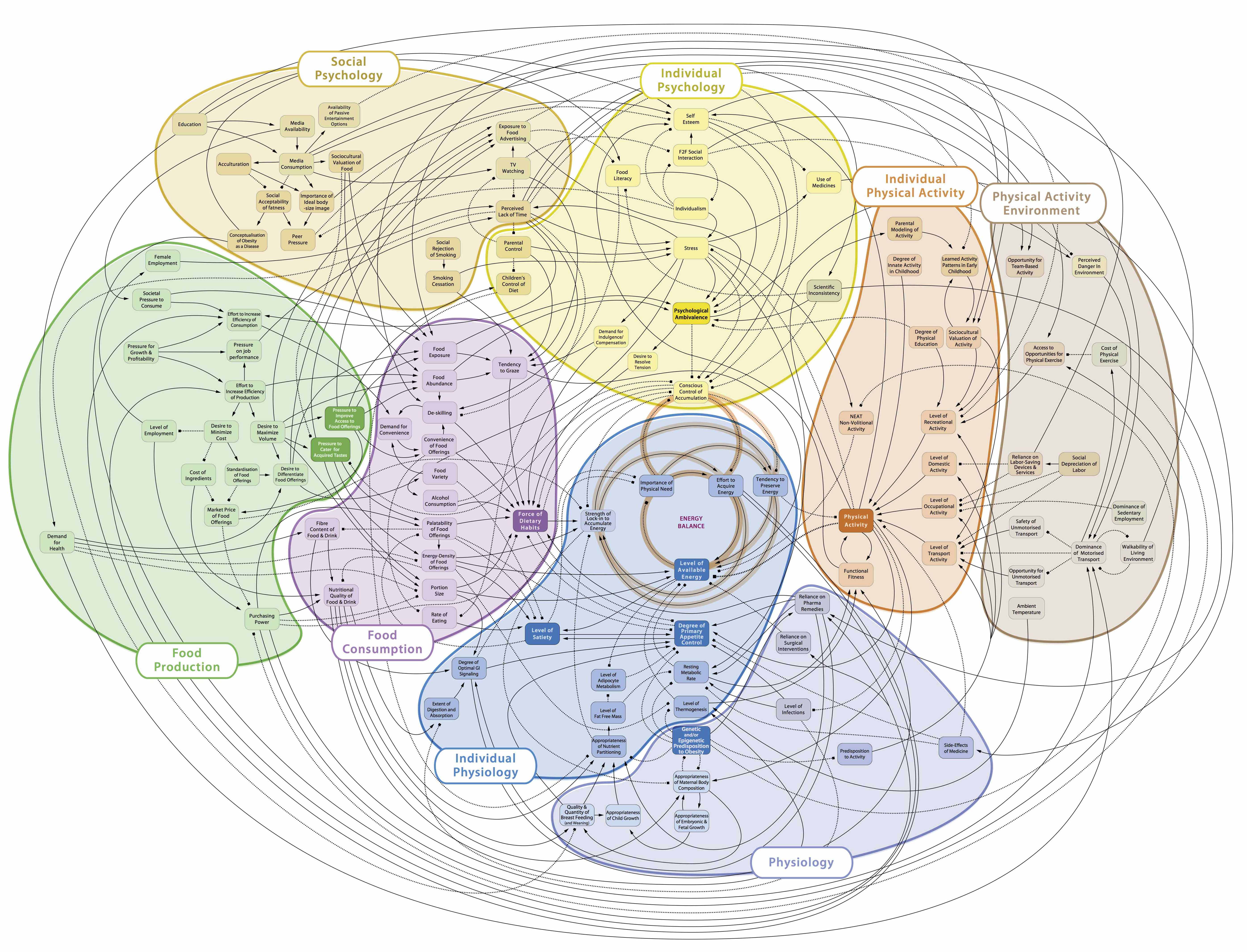 We built on ShiftN’s map to highlight the systems complexities of nutrition and physical health.
