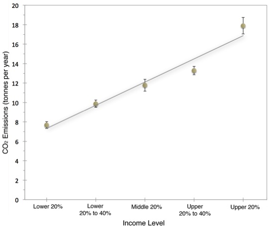 Data points represent means (with standard error bars) of each income level group. Data was collected by the Population Research Laboratory, University of Alberta, and was previously used for research conducted for: Kennedy, E.H., H. Krahn, and N.T. Krogman (2013). Egregious Emitters: Disproportionality in Household Carbon Footprints. Environment and Behaviour.