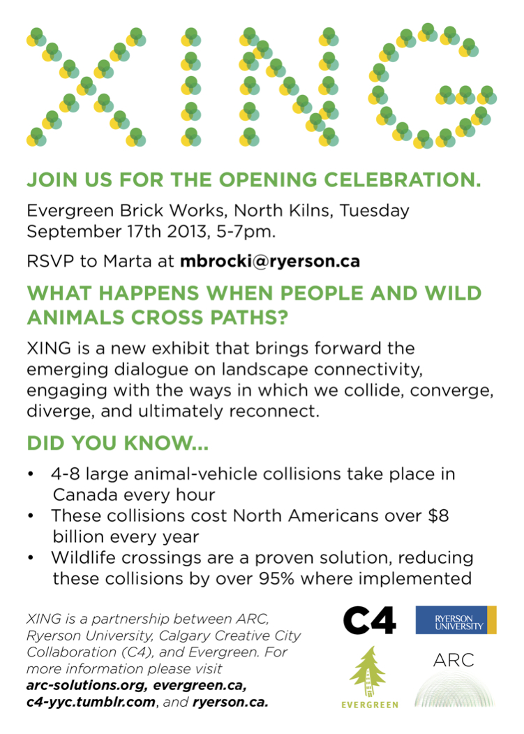XING is urban ecology exhibition, produced under the direction of Prof. Nina-Marie Lister, School of Urban and Regional Planning, Ryerson University. This exhibition is part of a landscape and infrastructure research collaborative with Evergreen Brickworks and ARC Solutions, and will be displayed at the Evergreen Brick Works Centre for Green Cities in Toronto from mid-September to October 15th, 2013. Join them for the opening celebration on Tuesday, 17th from 5-7pm.